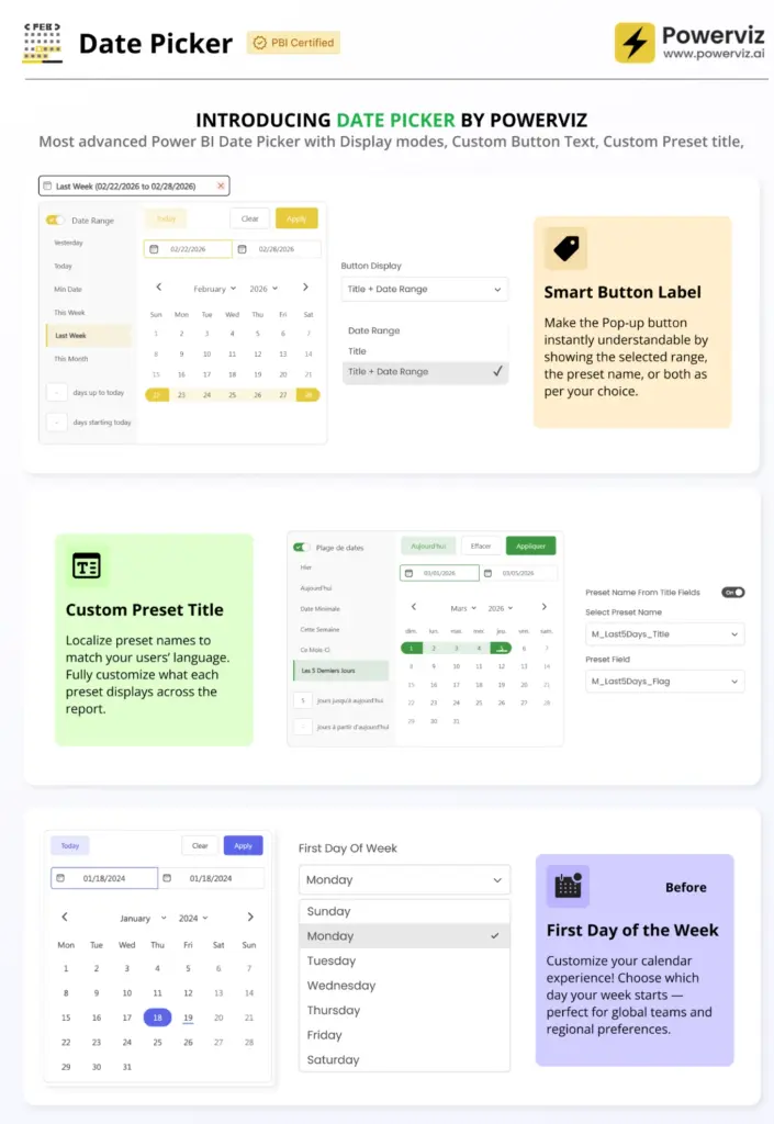 Por un lado, el Date Picker de Powerviz introduce un selector de fechas muy avanzado, con presets configurables, estilos personalizables y soporte para distintos formatos de calendario. Es especialmente útil en dashboards donde la selección temporal es clave.